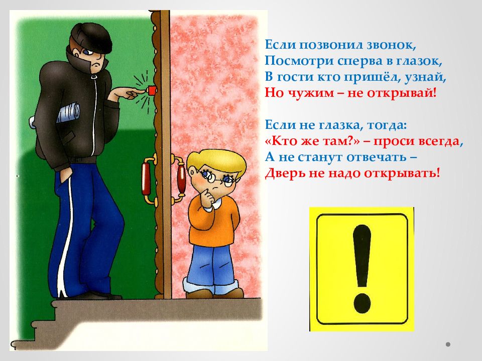 Если позвонил звонок, Посмотри сперва в глазок, В гости кто пришёл, узнай, Но чужим – не открывай! Если не глазка, тогда: «Кто же там?» – проси всегда, А не станут отвечать – Дверь не надо открывать!