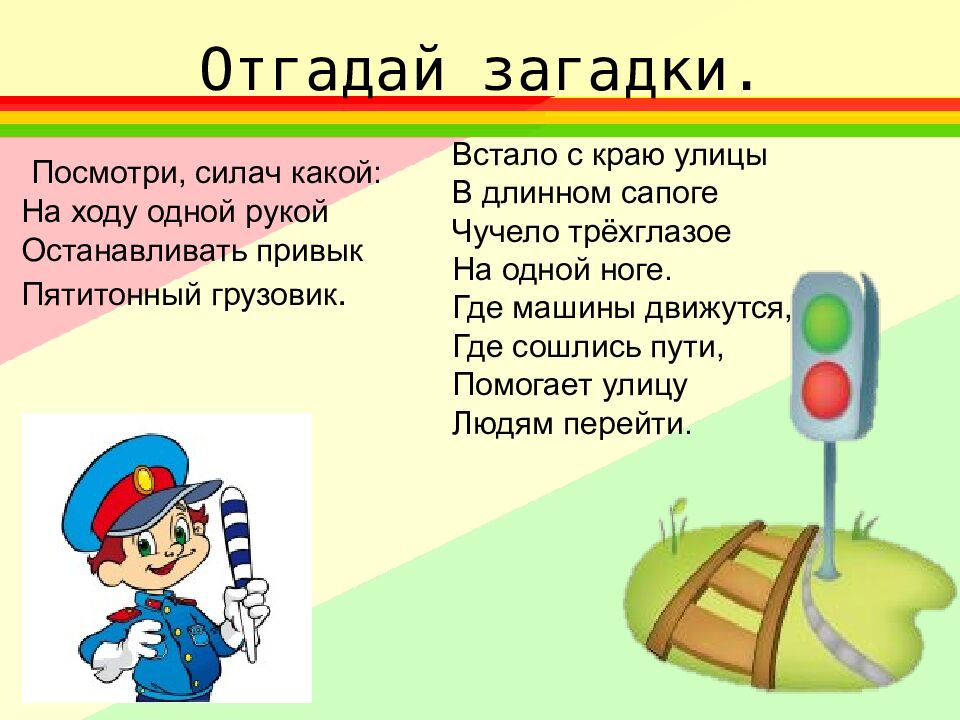 Посмотри, силач какой: На ходу одной рукой Останавливать привык Пятитонный грузовик. Встало с краю улицы В длинном сапоге Чучело трёхглазое На одной ноге. Где машины движутся, Где сошлись пути, Помогает улицу Людям перейти.