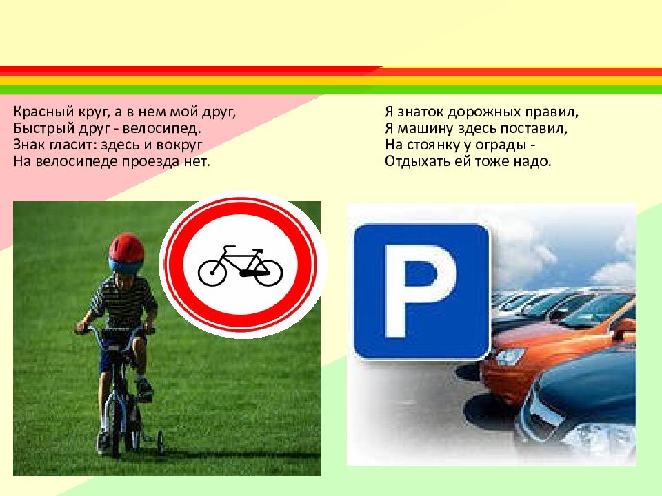 Красный круг, а в нем мой друг, Быстрый друг - велосипед. Знак гласит: здесь и вокруг На велосипеде проезда нет. Я знаток дорожных правил, Я машину здесь поставил, На стоянку у ограды - Отдыхать ей тоже надо.