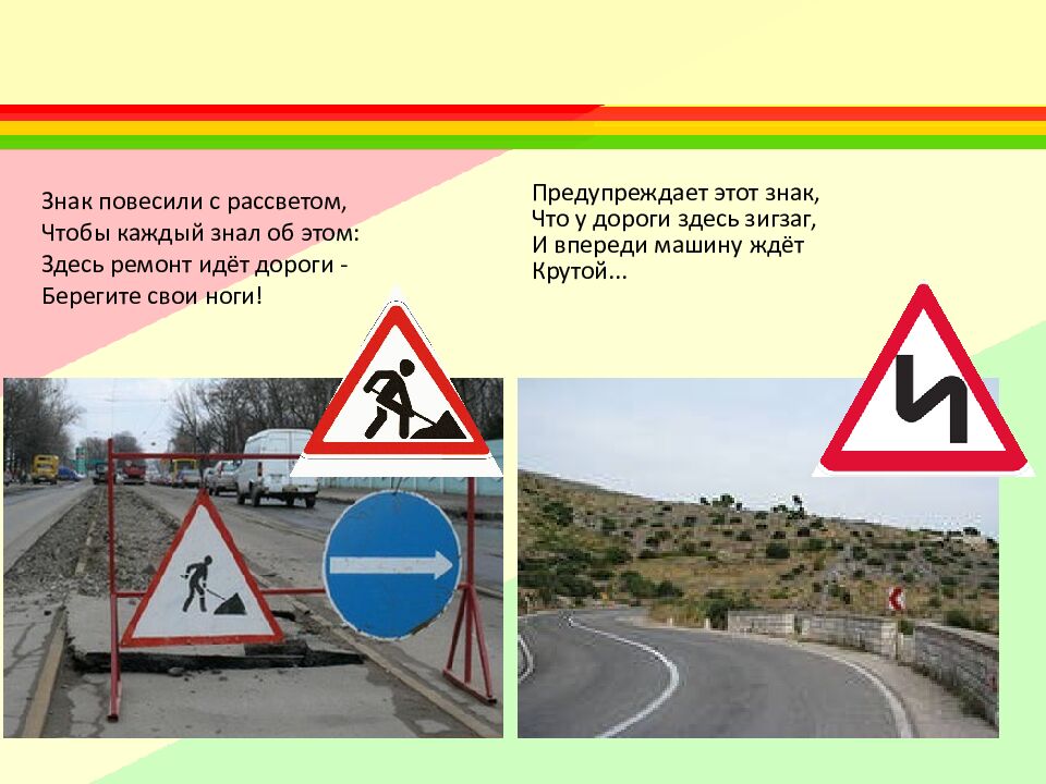 Знак повесили с рассветом, Чтобы каждый знал об этом: Здесь ремонт идёт дороги - Берегите свои ноги! Предупреждает этот знак, Что у дороги здесь зигзаг, И впереди машину ждёт Крутой...