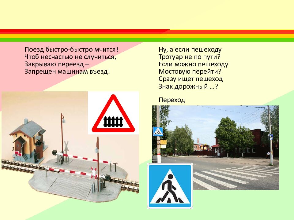 Поезд быстро-быстро мчится! Чтоб несчастью не случиться, Закрываю переезд – Запрещен машинам въезд! Шлагбаум Ну, а если пешеходу Тротуар не по пути? Если можно пешеходу Мостовую перейти? Сразу ищет пешеход Знак дорожный …? Переход
