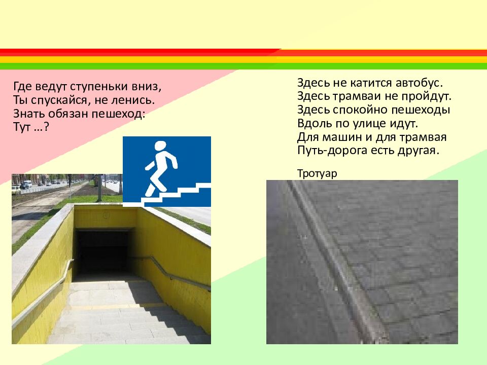 Где ведут ступеньки вниз, Ты спускайся, не ленись. Знать обязан пешеход: Тут …? Здесь не катится автобус. Здесь трамваи не пройдут. Здесь спокойно пешеходы Вдоль по улице идут. Для машин и для трамвая Путь-дорога есть другая. Тротуар