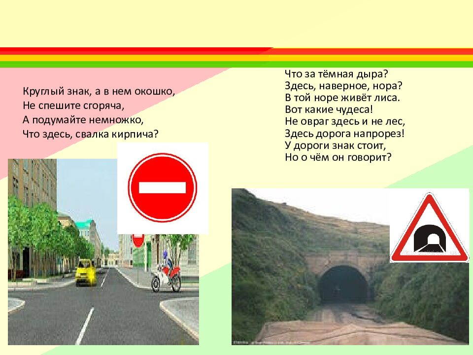 Круглый знак, а в нем окошко, Не спешите сгоряча, А подумайте немножко, Что здесь, свалка кирпича? Что за тёмная дыра? Здесь, наверное, нора? В той норе живёт лиса. Вот какие чудеса! Не овраг здесь и не лес, Здесь дорога напрорез ! У дороги знак стоит, Но о чём он говорит?