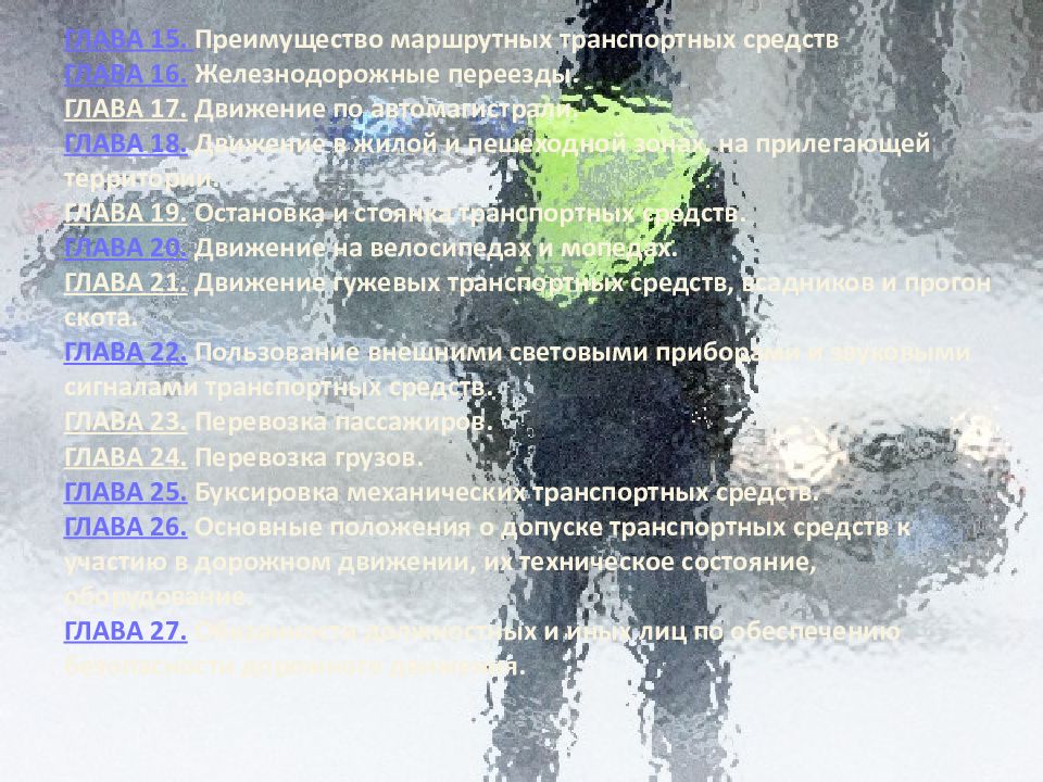 ГЛАВА 15. Преимущество маршрутных транспортных средств ГЛАВА 16. Железнодорожные переезды. ГЛАВА 17. Движение по автомагистрали. ГЛАВА 18. Движение в жилой и пешеходной зонах, на прилегающей территории. ГЛАВА 19. Остановка и стоянка транспортных средств. ГЛАВА 20. Движение на велосипедах и мопедах. ГЛАВА 21. Движение гужевых транспортных средств, всадников и прогон скота. ГЛАВА 22. Пользование внешними световыми приборами и звуковыми сигналами транспортных средств. ГЛАВА 23. Перевозка пассажиров. ГЛАВА 24. Перевозка грузов. ГЛАВА 25. Буксировка механических транспортных средств. ГЛАВА 26. Основные положения о допуске транспортных средств к участию в дорожном движении, их техническое состояние, оборудование. ГЛАВА 27. Обязанности должностных и иных лиц по обеспечению безопасности дорожного движения.
