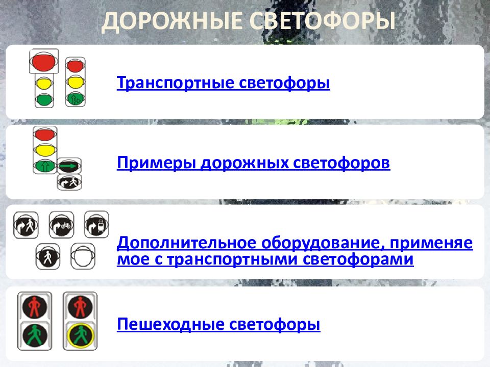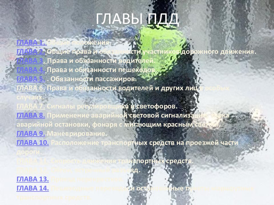 ГЛАВА 1. Общие положения. ГЛАВА 2. Общие права и обязанности участников дорожного движения. ГЛАВА 3. Права и обязанности водителей. ГЛАВА 4. Права и обязанности пешеходов. ГЛАВА 5.. Обязанности пассажиров. ГЛАВА 6. Права и обязанности водителей и других лиц в особых случаях. ГЛАВА 7. Сигналы регулировщика и светофоров. ГЛАВА 8. Применение аварийной световой сигнализации, знака аварийной остановки, фонаря с мигающим красным светом. ГЛАВА 9. Маневрирование. ГЛАВА 10. Расположение транспортных средств на проезжей части дороги. ГЛАВА 11. Скорость движения транспортных средств. ГЛАВА 12. Обгон, встречный разъезд. ГЛАВА 13. Проезд перекрестков. ГЛАВА 14. Пешеходные переходы и остановочные пункты маршрутных транспортных средств.