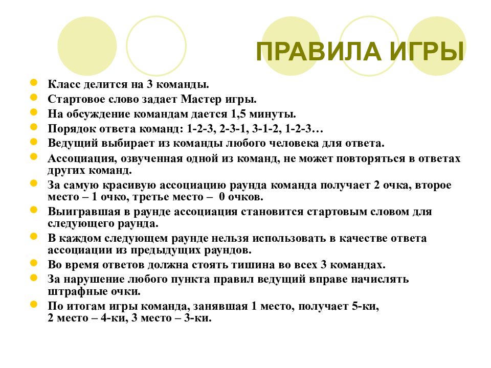 ПРАВИЛА ИГРЫ Класс делится на 3 команды. Стартовое слово задает Мастер игры. На обсуждение командам дается 1,5 минуты. Порядок ответа команд: 1-2-3, 2-3-1, 3-1-2, 1-2-3… Ведущий выбирает из команды любого человека для ответа. Ассоциация, озвученная одной из команд, не может повторяться в ответах других команд. За самую красивую ассоциацию раунда команда получает 2 очка, второе место – 1 очко, третье место – 0 очков. Выигравшая в раунде ассоциация становится стартовым словом для следующего раунда. В каждом следующем раунде нельзя использовать в качестве ответа ассоциации из предыдущих раундов. Во время ответов должна стоять тишина во всех 3 командах. За нарушение любого пункта правил ведущий вправе начислять штрафные очки. По итогам игры команда, занявшая 1 место, получает 5-ки, 2 место – 4-ки, 3 место – 3-ки.