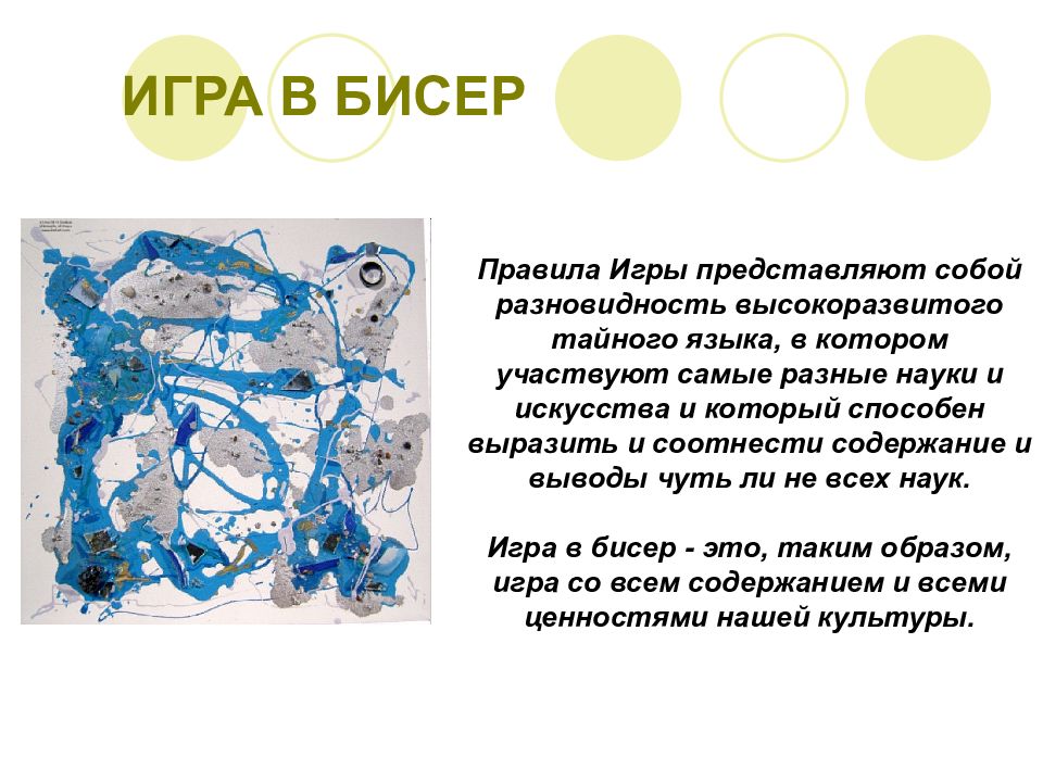 Правила Игры представляют собой разновидность высокоразвитого тайного языка, в котором участвуют самые разные науки и искусства и который способен выразить и соотнести содержание и выводы чуть ли не всех наук. Игра в бисер - это, таким образом, игра со всем содержанием и всеми ценностями нашей культуры. ИГРА В БИСЕР