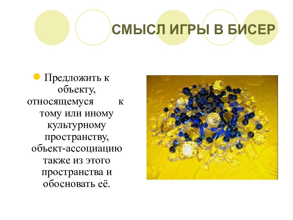 СМЫСЛ ИГРЫ В БИСЕР Предложить к объекту, относящемуся к тому или иному культурному пространству, объект-ассоциацию также из этого пространства и обосновать её.
