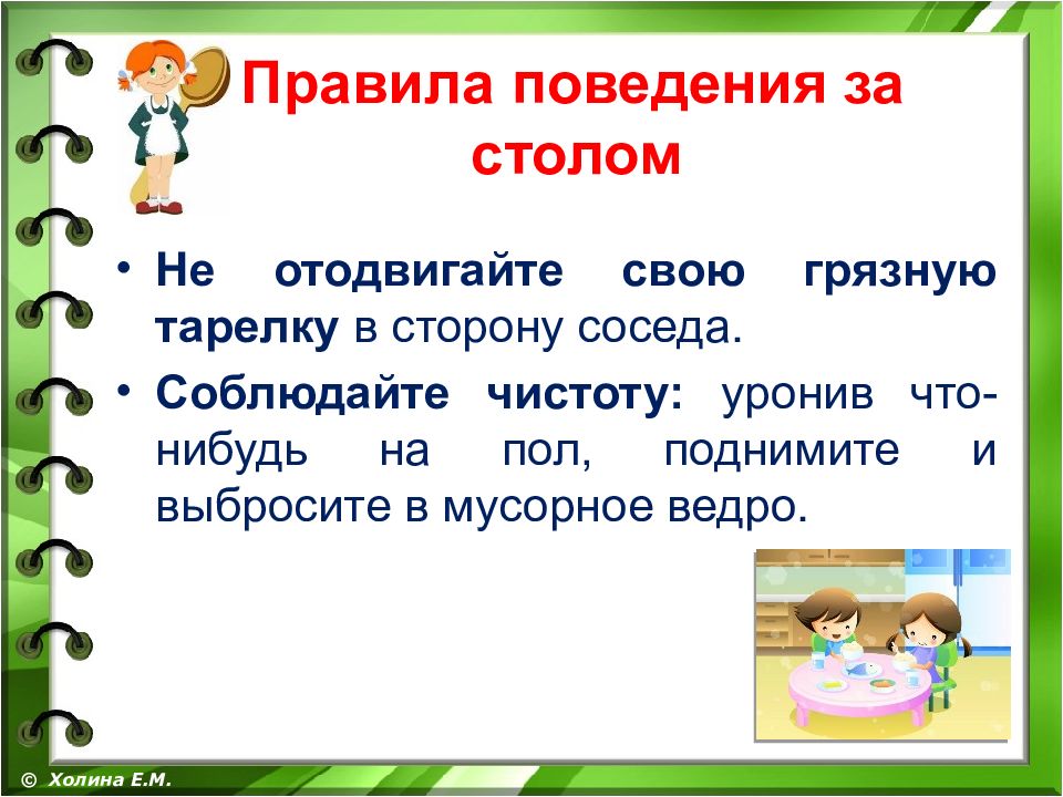 Правила поведения за столом Не отодвигайте свою грязную тарелку в сторону соседа. Соблюдайте чистоту: уронив что-нибудь на пол, поднимите и выбросите в мусорное ведро. © Холина Е.М.