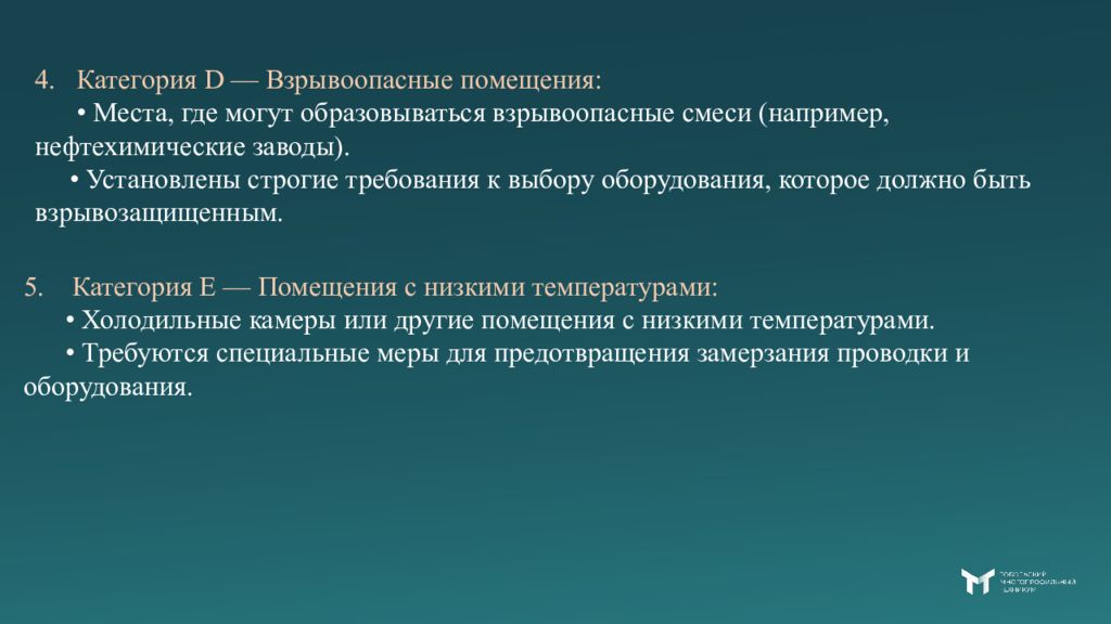 5. Категория E — Помещения с низкими температурами: • Холодильные камеры или другие помещения с низкими температурами. • Требуются специальные меры для предотвращения замерзания проводки и оборудования. 4. Категория D — Взрывоопасные помещения: • Места, где могут образовываться взрывоопасные смеси (например, нефтехимические заводы). • Установлены строгие требования к выбору оборудования, которое должно быть взрывозащищенным.