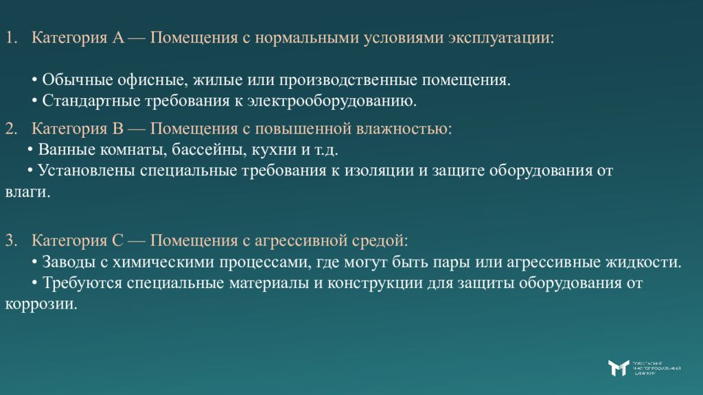 Категория A — Помещения с нормальными условиями эксплуатации: • Обычные офисные, жилые или производственные помещения. • Стандартные требования к электрооборудованию. 2. Категория B — Помещения с повышенной влажностью: • Ванные комнаты, бассейны, кухни и т.д. • Установлены специальные требования к изоляции и защите оборудования от влаги. 3. Категория C — Помещения с агрессивной средой: • Заводы с химическими процессами, где могут быть пары или агрессивные жидкости. • Требуются специальные материалы и конструкции для защиты оборудования от коррозии.