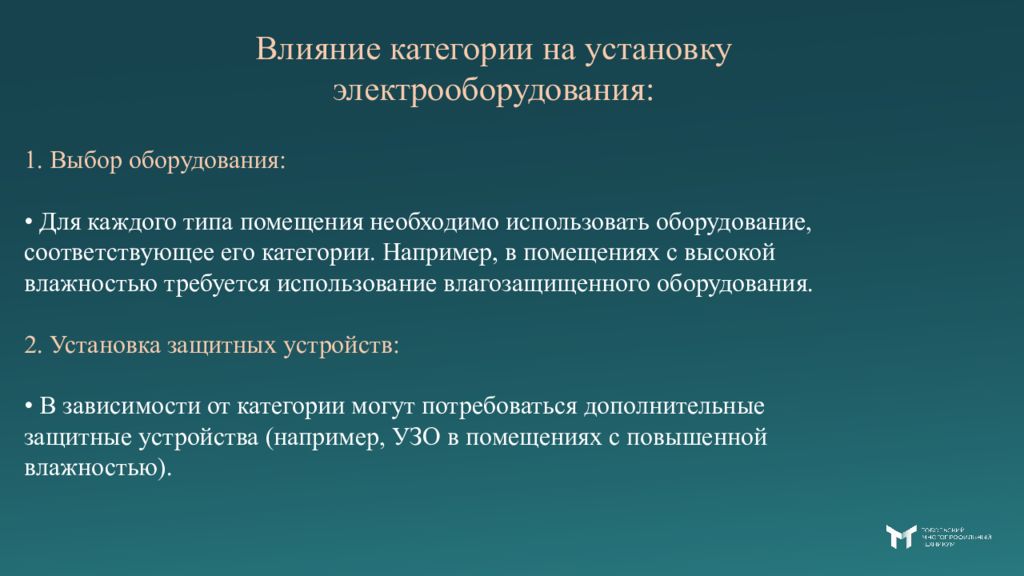 Влияние категории на установку электрооборудования: 1. Выбор оборудования: • Для каждого типа помещения необходимо использовать оборудование, соответствующее его категории. Например, в помещениях с высокой влажностью требуется использование влагозащищенного оборудования. 2. Установка защитных устройств: • В зависимости от категории могут потребоваться дополнительные защитные устройства (например, УЗО в помещениях с повышенной влажностью).