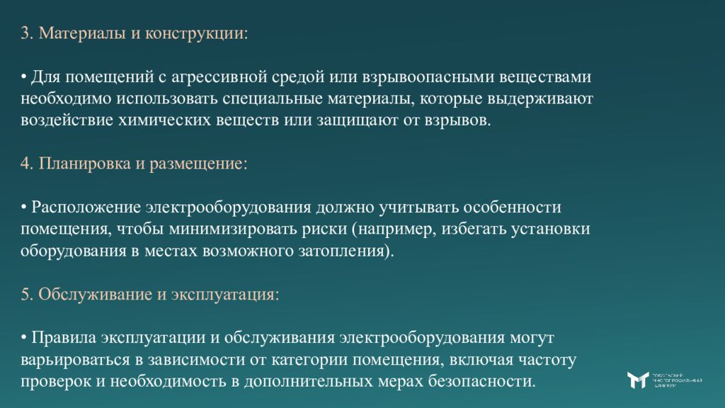 3. Материалы и конструкции: • Для помещений с агрессивной средой или взрывоопасными веществами необходимо использовать специальные материалы, которые выдерживают воздействие химических веществ или защищают от взрывов. 4. Планировка и размещение: • Расположение электрооборудования должно учитывать особенности помещения, чтобы минимизировать риски (например, избегать установки оборудования в местах возможного затопления). 5. Обслуживание и эксплуатация: • Правила эксплуатации и обслуживания электрооборудования могут варьироваться в зависимости от категории помещения, включая частоту проверок и необходимость в дополнительных мерах безопасности.