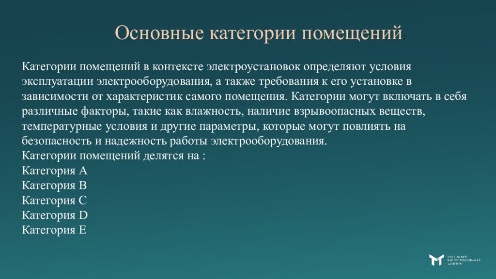 Основные категории помещений : Категории помещений в контексте электроустановок определяют условия эксплуатации электрооборудования, а также требования к его установке в зависимости от характеристик самого помещения. Категории могут включать в себя различные факторы, такие как влажность, наличие взрывоопасных веществ, температурные условия и другие параметры, которые могут повлиять на безопасность и надежность работы электрооборудования. Категории помещений делятся на : Категория А Категория В Категория С Категория D Категория Е