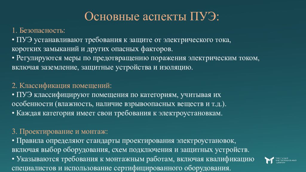 Основные аспекты ПУЭ: 1. Безопасность: • ПУЭ устанавливают требования к защите от электрического тока, коротких замыканий и других опасных факторов. • Регулируются меры по предотвращению поражения электрическим током, включая заземление, защитные устройства и изоляцию. 2. Классификация помещений: • ПУЭ классифицируют помещения по категориям, учитывая их особенности (влажность, наличие взрывоопасных веществ и т.д.). • Каждая категория имеет свои требования к электроустановкам. 3. Проектирование и монтаж: • Правила определяют стандарты проектирования электроустановок, включая выбор оборудования, схем подключения и защитных устройств. • Указываются требования к монтажным работам, включая квалификацию специалистов и использование сертифицированного оборудования.