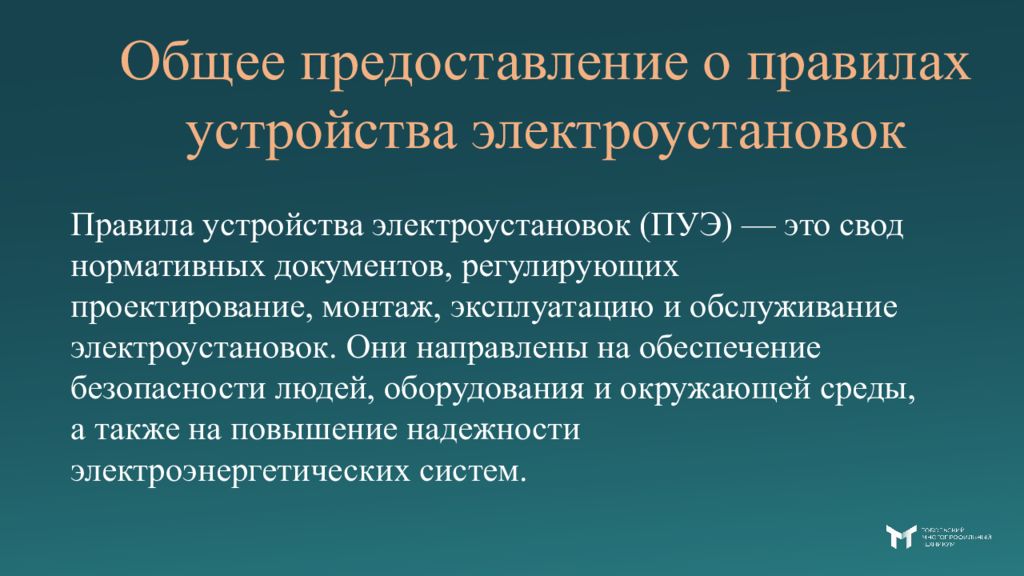 Общее предоставление о правилах устройства электроустановок Правила устройства электроустановок (ПУЭ) — это свод нормативных документов, регулирующих проектирование, монтаж, эксплуатацию и обслуживание электроустановок. Они направлены на обеспечение безопасности людей, оборудования и окружающей среды, а также на повышение надежности электроэнергетических систем.