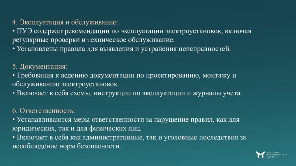 4. Эксплуатация и обслуживание: • ПУЭ содержат рекомендации по эксплуатации электроустановок, включая регулярные проверки и техническое обслуживание. • Установлены правила для выявления и устранения неисправностей. 5. Документация: • Требования к ведению документации по проектированию, монтажу и обслуживанию электроустановок. • Включает в себя схемы, инструкции по эксплуатации и журналы учета. 6. Ответственность: • Устанавливаются меры ответственности за нарушение правил, как для юридических, так и для физических лиц. • Включает в себя как административные, так и уголовные последствия за несоблюдение норм безопасности.