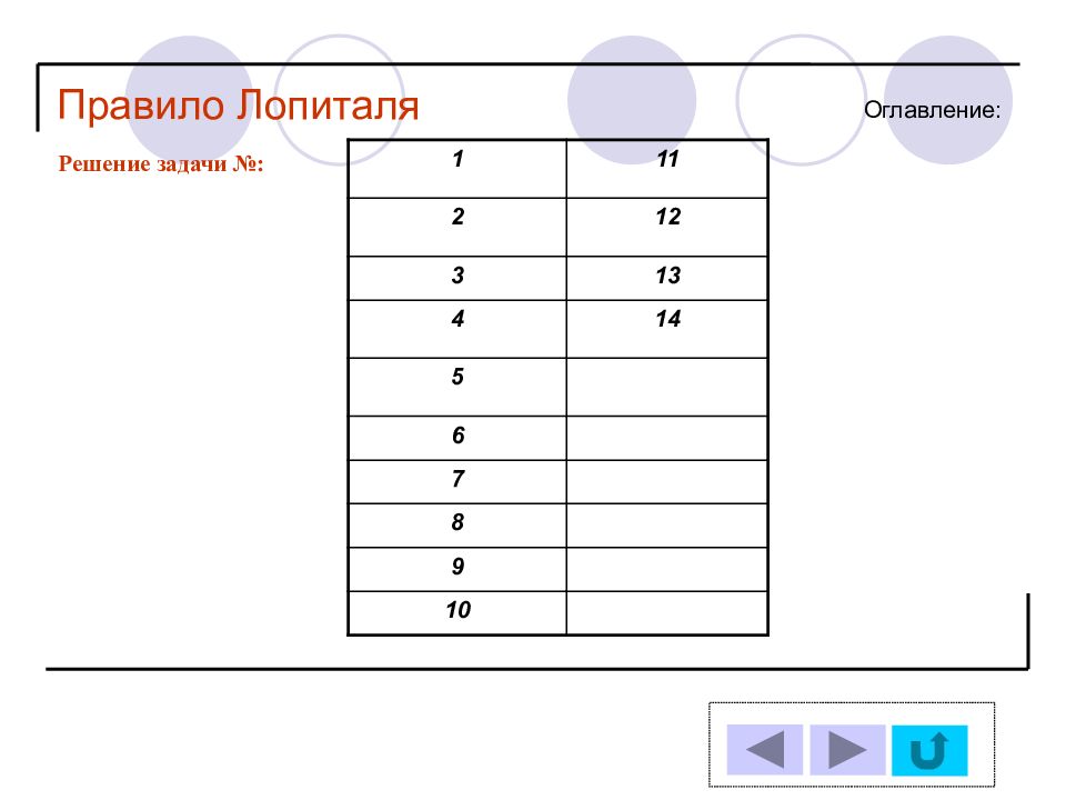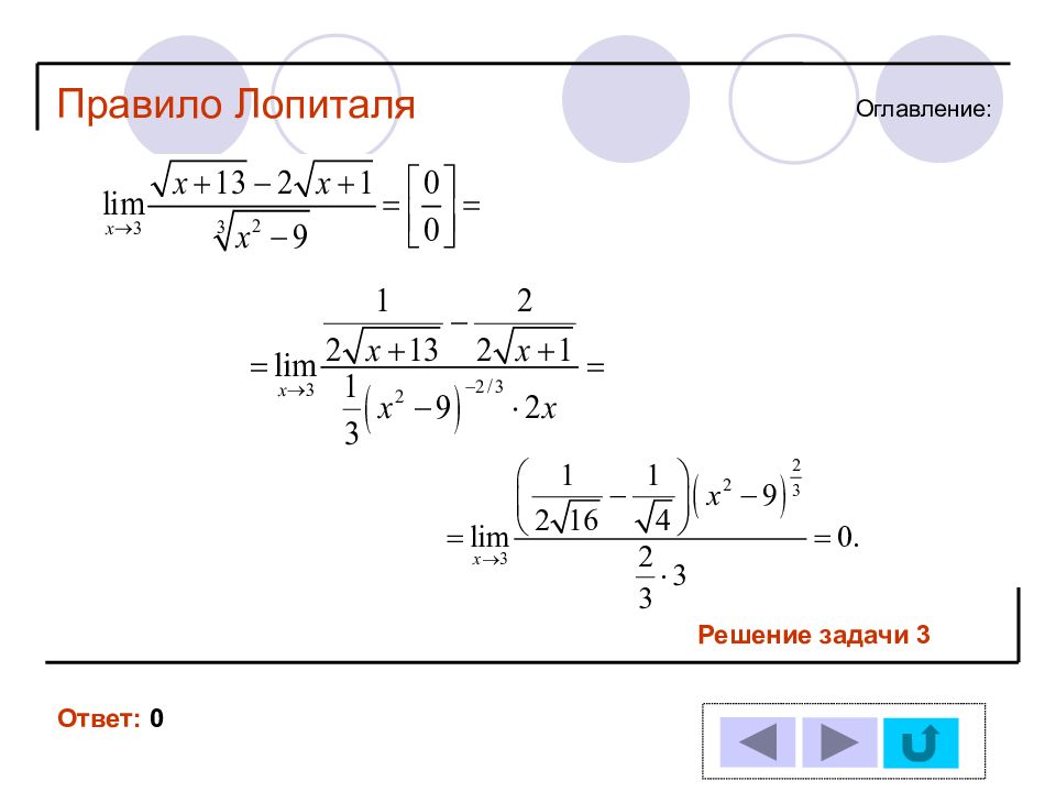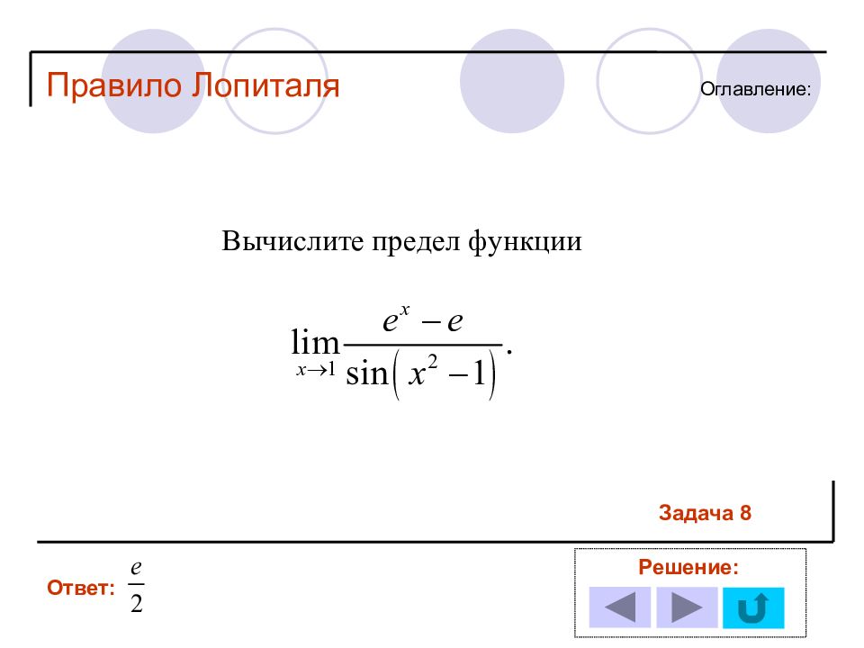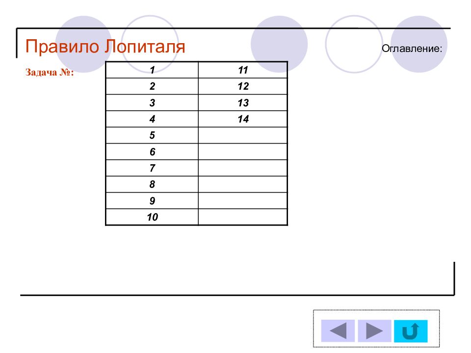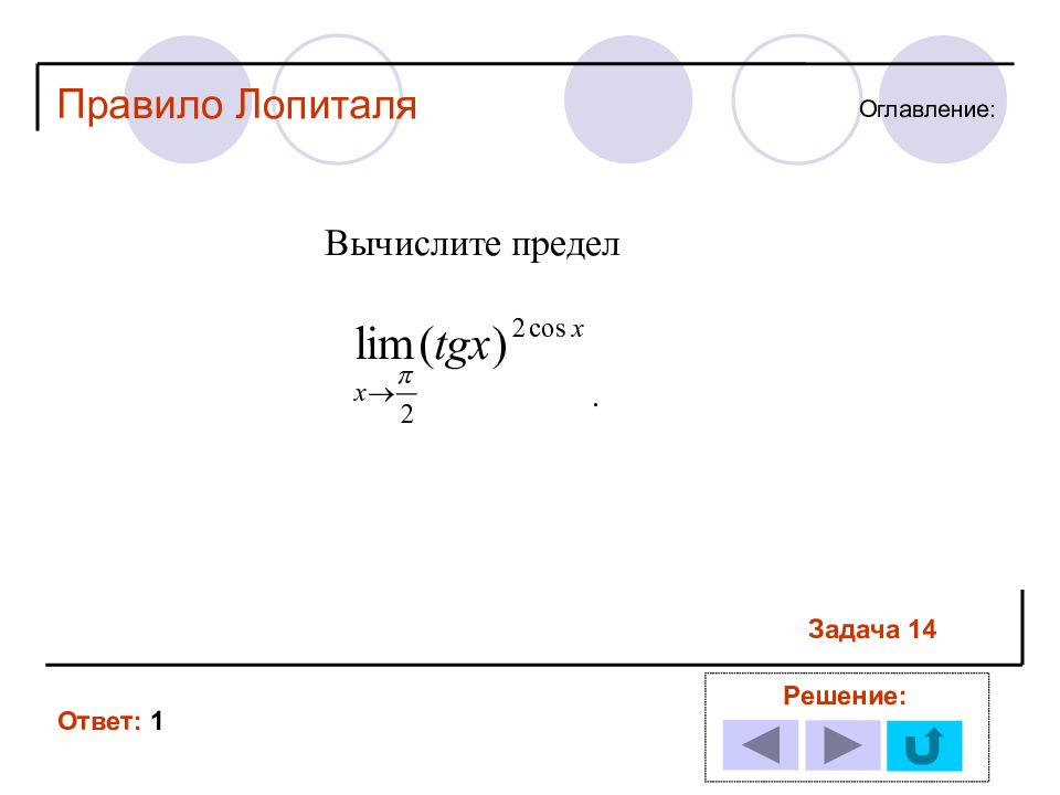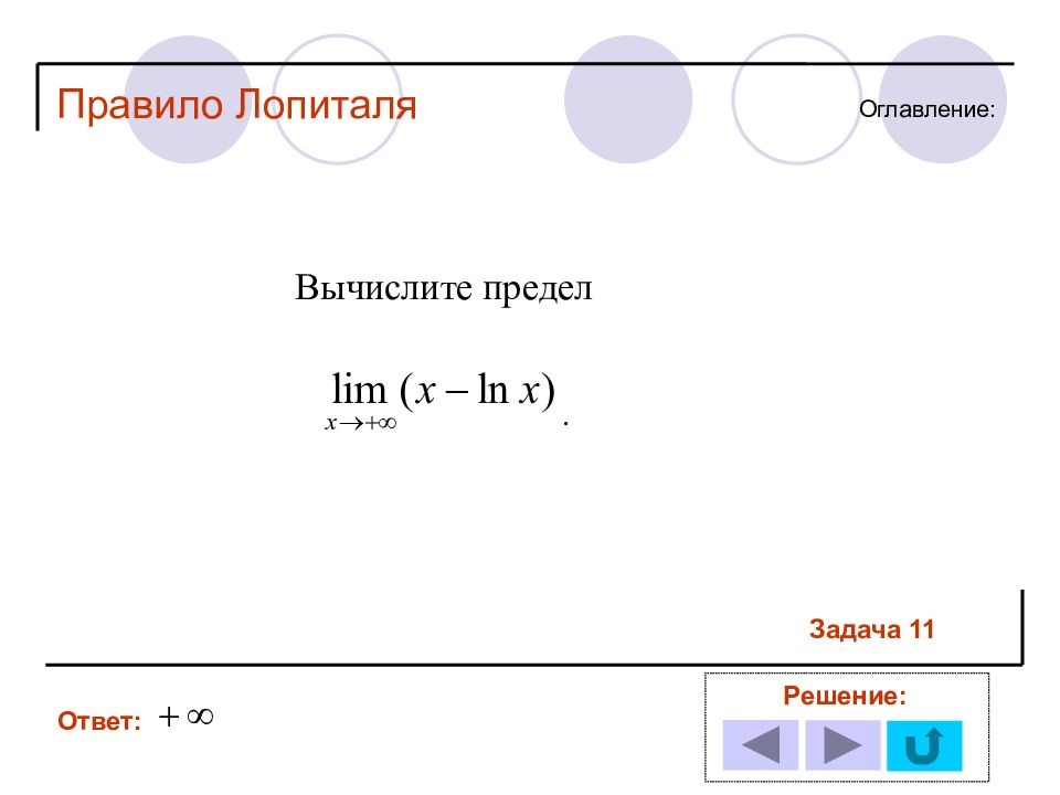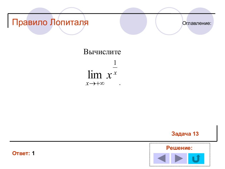 1 11 2 12 3 13 4 14 5 6 7 8 9 10 Решение задачи № : Оглавление : Правило Лопиталя