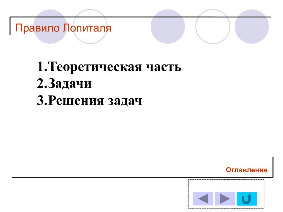 1.Теоретическая часть 2.Задачи 3.Решения задач Оглавление Правило Лопиталя