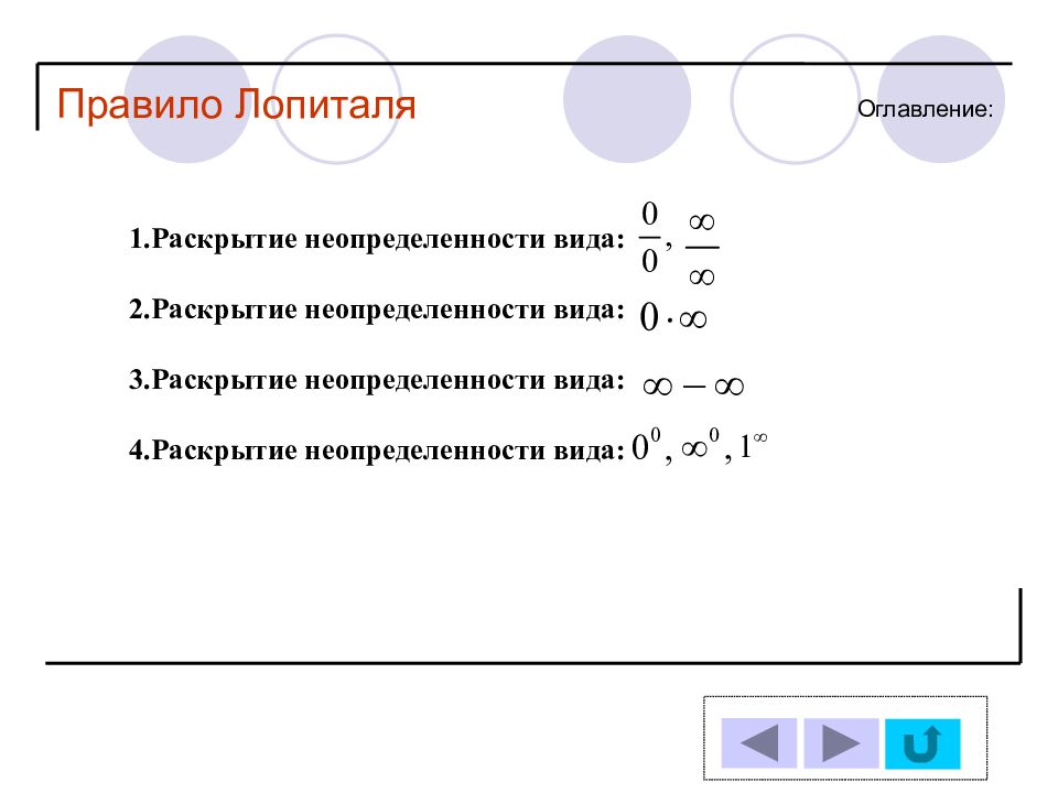 Оглавление : Правило Лопиталя 1.Раскрытие неопределенности вида : 2.Раскрытие неопределенности вида : 3.Раскрытие неопределенности вида : 4.Раскрытие неопределенности вида :