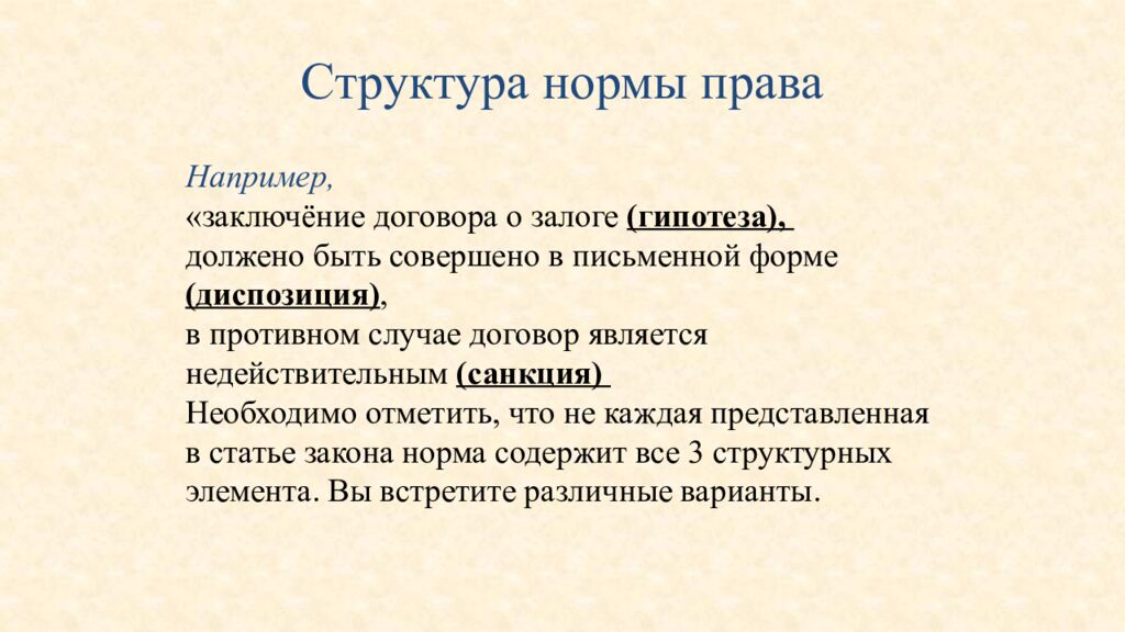 Например, « заключёние договора о залоге (гипотеза), должено быть совершено в письменной форме (диспозиция), в противном случае договор является недействительным (санкция) Необходимо отметить, что не каждая представленная в статье закона норма содержит все 3 структурных элемента. Вы встретите различные варианты. Структура нормы права