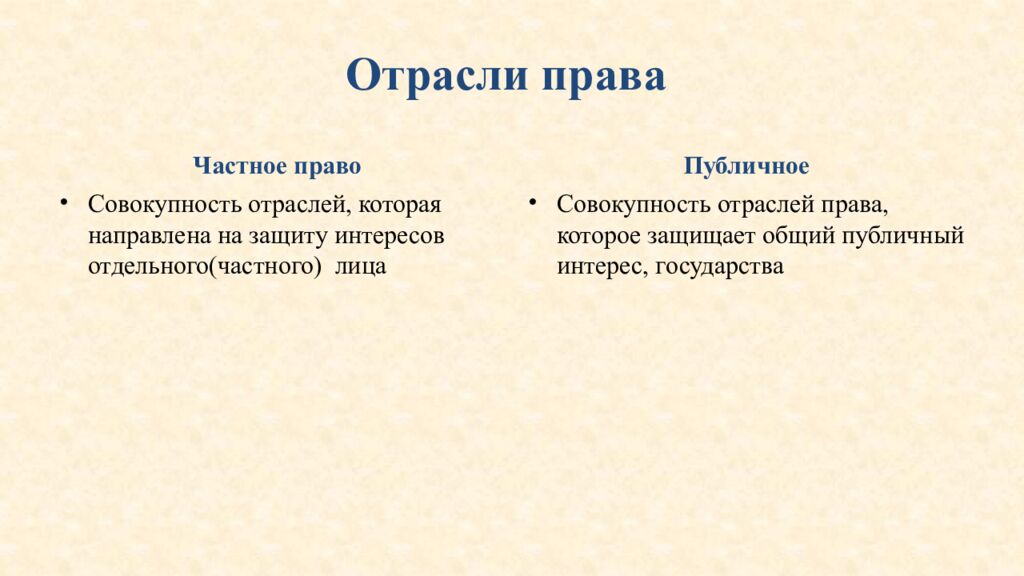 Частное право Совокупность отраслей, которая направлена на защиту интересов отдельного(частного) лица Публичное Совокупность отраслей права, которое защищает общий публичный интерес, государства