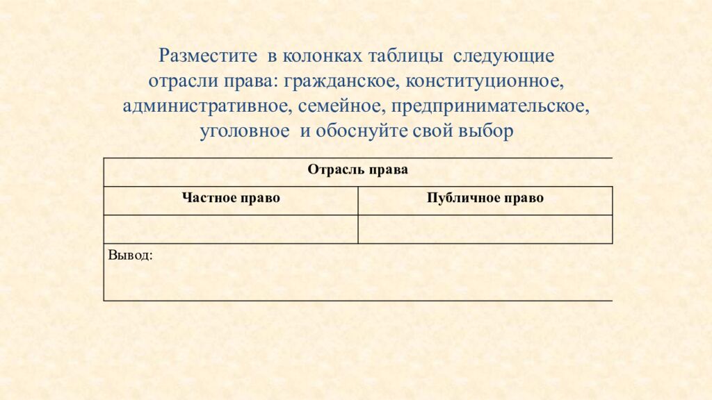 Слайд 24: Разместите в колонках таблицы следующие отрасли права: гражданское, конституционное, административное, семейное, предпринимательское, уголовное и обоснуйте свой выбор