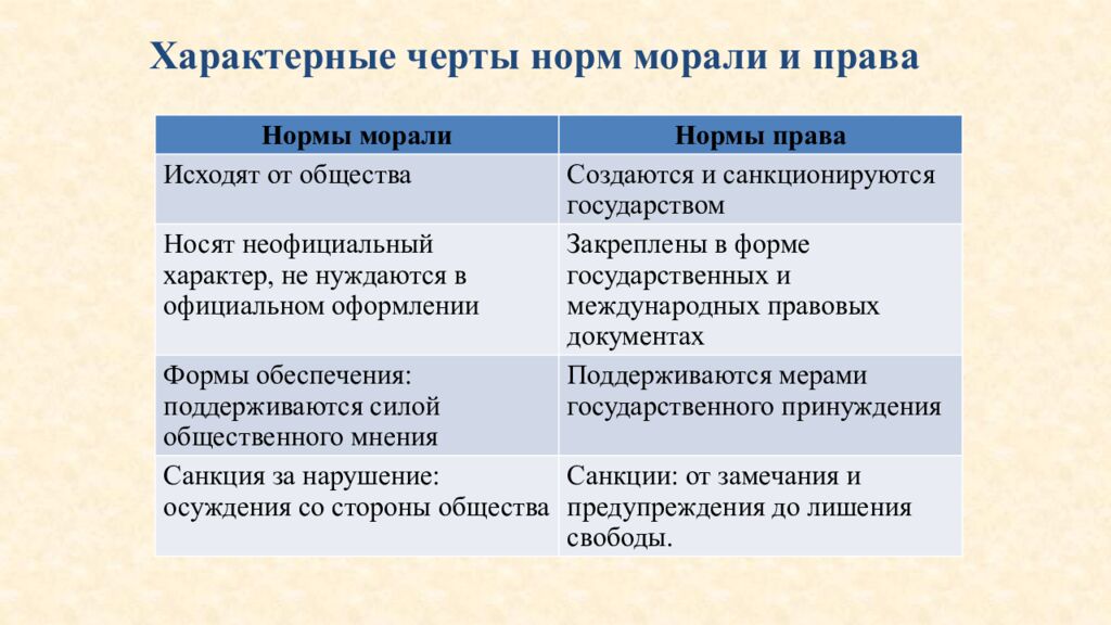Нормы морали Нормы права Исходят от общества Создаются и санкционируются государством Носят неофициальный характер, не нуждаются в официальном оформлении Закреплены в форме государственных и международных правовых документах Формы обеспечения: поддерживаются силой общественного мнения Поддерживаются мерами государственного принуждения Санкция за нарушение: осуждения со стороны общества Санкции: от замечания и предупреждения до лишения свободы.