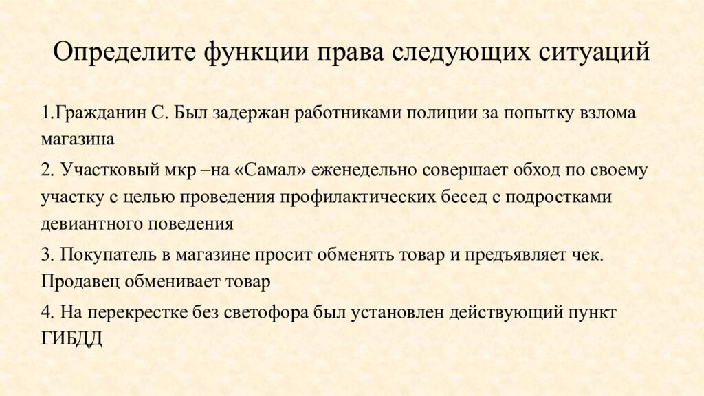 1.Гражданин С. Был задержан работниками полиции за попытку взлома магазина 2. Участковый мкр –на « Самал » еженедельно совершает обход по своему участку с целью проведения профилактических бесед с подростками девиантного поведения 3. Покупатель в магазине просит обменять товар и предъявляет чек. Продавец обменивает товар 4. На перекрестке без светофора был установлен действующий пункт ГИБДД