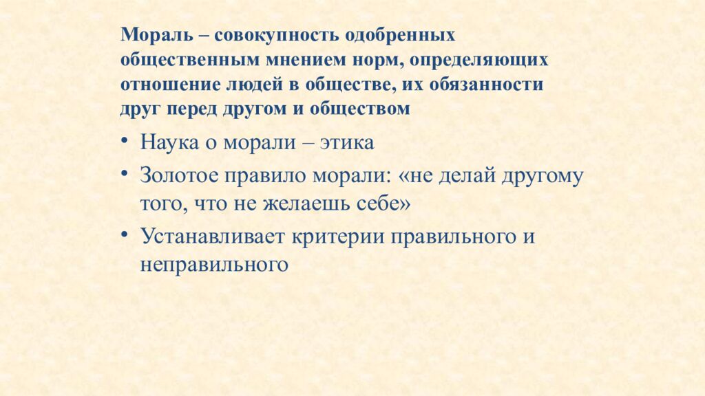Слайд 21: Мораль – совокупность одобренных общественным мнением норм, определяющих отношение людей в обществе, их обязанности друг перед другом и обществом