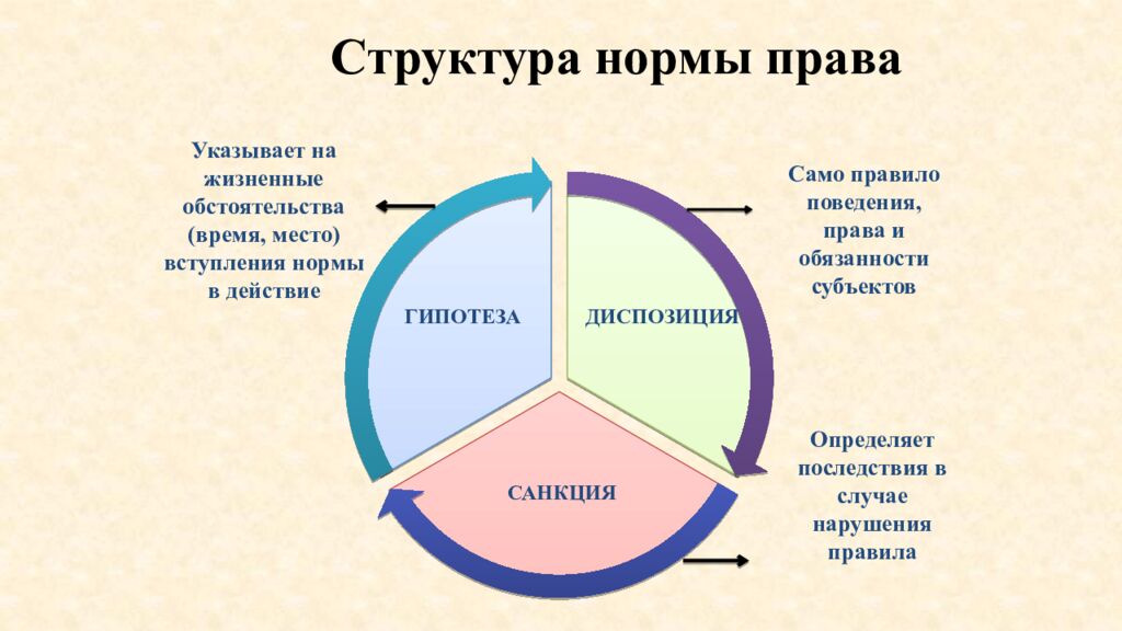 Указывает на жизненные обстоятельства (время, место) вступления нормы в действие ДИСПОЗИЦИЯ ГИПОТЕЗА САНКЦИЯ Само правило поведения, права и обязанности субъектов Определяет последствия в случае нарушения правила