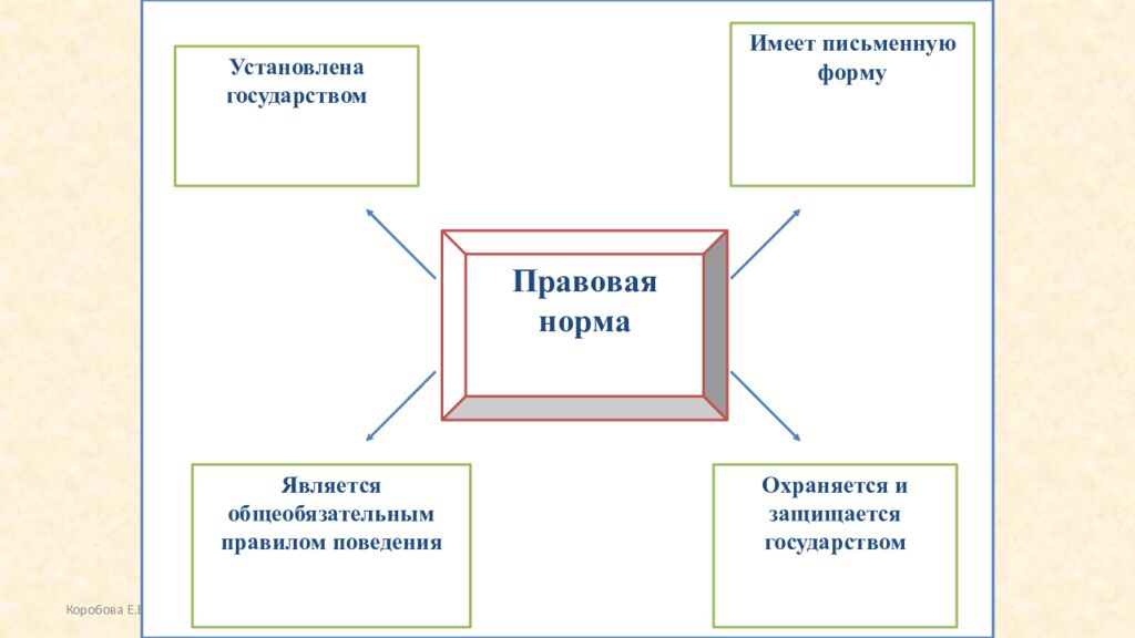 Коробова Е.В. Установлена государством Является общеобязательным правилом поведения Охраняется и защищается государством Имеет письменную форму Правовая норма