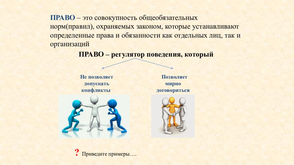 ПРАВО – это совокупность общеобязательных норм(правил), охраняемых законом, которые устанавливают определенные права и обязанности как отдельных лиц, так и организаций ПРАВО – регулятор поведения, который Не позволяет допускать конфликты Позволяет мирно договориться ? Приведите примеры….