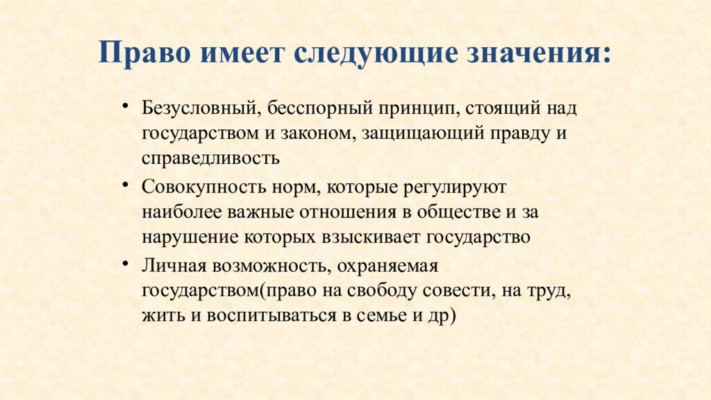 Безусловный, бесспорный принцип, стоящий над государством и законом, защищающий правду и справедливость Совокупность норм, которые регулируют наиболее важные отношения в обществе и за нарушение которых взыскивает государство Личная возможность, охраняемая государством(право на свободу совести, на труд, жить и воспитываться в семье и др )