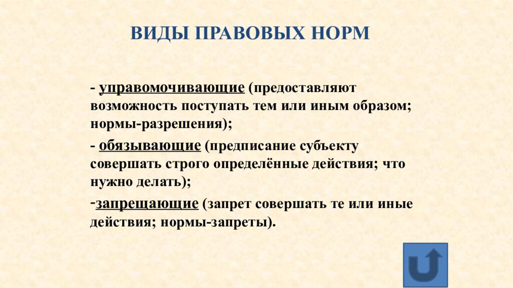 - управомочивающие (предоставляют возможность поступать тем или иным образом; нормы-разрешения); - обязывающие (предписание субъекту совершать строго определённые действия; что нужно делать); запрещающие (запрет совершать те или иные действия; нормы-запреты).