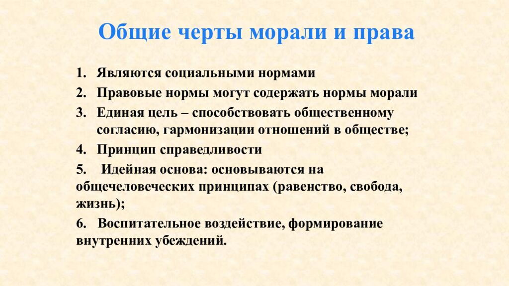 Являются социальными нормами Правовые нормы могут содержать нормы морали Единая цель – способствовать общественному согласию, гармонизации отношений в обществе; Принцип справедливости 5. Идейная основа: основываются на общечеловеческих принципах (равенство, свобода, жизнь); 6. Воспитательное воздействие, формирование внутренних убеждений. Общие черты морали и права