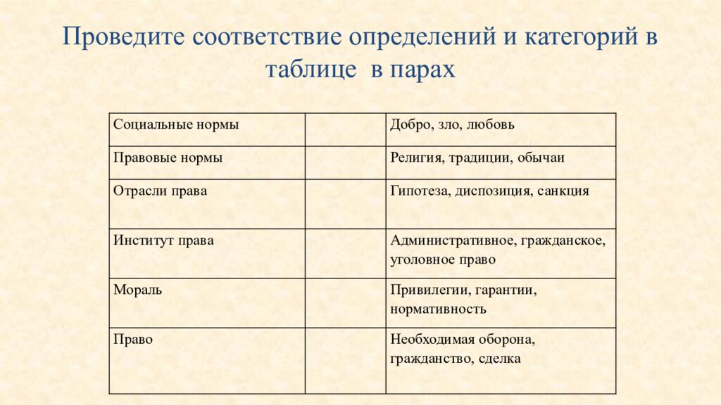 Социальные нормы Добро, зло, любовь Правовые нормы Религия, традиции, обычаи Отрасли права Гипотеза, диспозиция, санкция Институт права Административное, гражданское, уголовное право Мораль Привилегии, гарантии, нормативность Право Необходимая оборона, гражданство, сделка