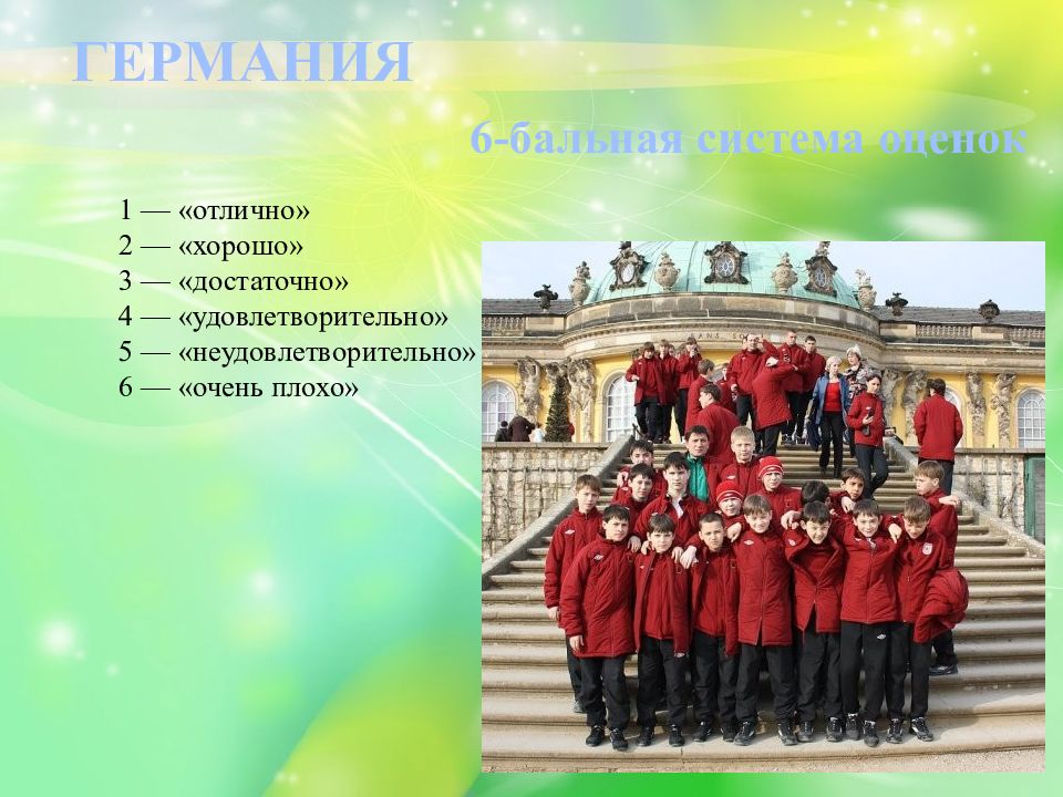 1 — «отлично» 2 — «хорошо» 3 — «достаточно» 4 — «удовлетворительно» 5 — «неудовлетворительно» 6 — «очень плохо» 6-бальная система оценок ГЕРМАНИЯ
