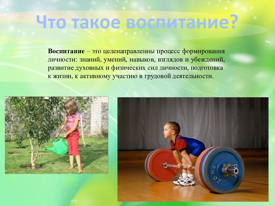 Что такое воспитание? Воспитание – это целенаправленны процесс формирования личности: знаний, умений, навыков, взглядов и убеждений, развитие духовных и физических сил личности, подготовка к жизни, к активному участию в трудовой деятельности.
