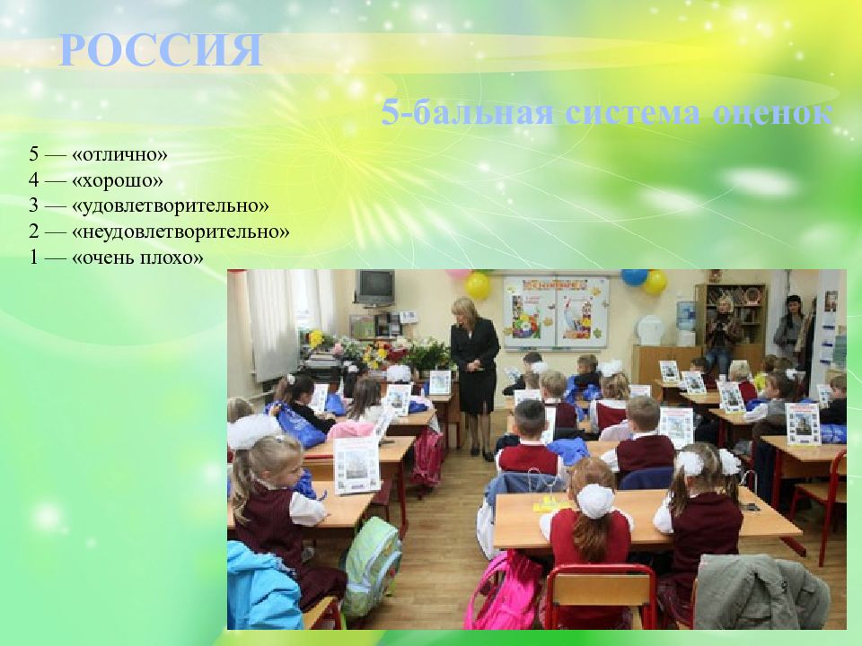 РОСС ИЯ 5-бальная система оценок 5 — «отлично» 4 — «хорошо» 3 — «удовлетворительно» 2 — «неудовлетворительно» 1 — «очень плохо»
