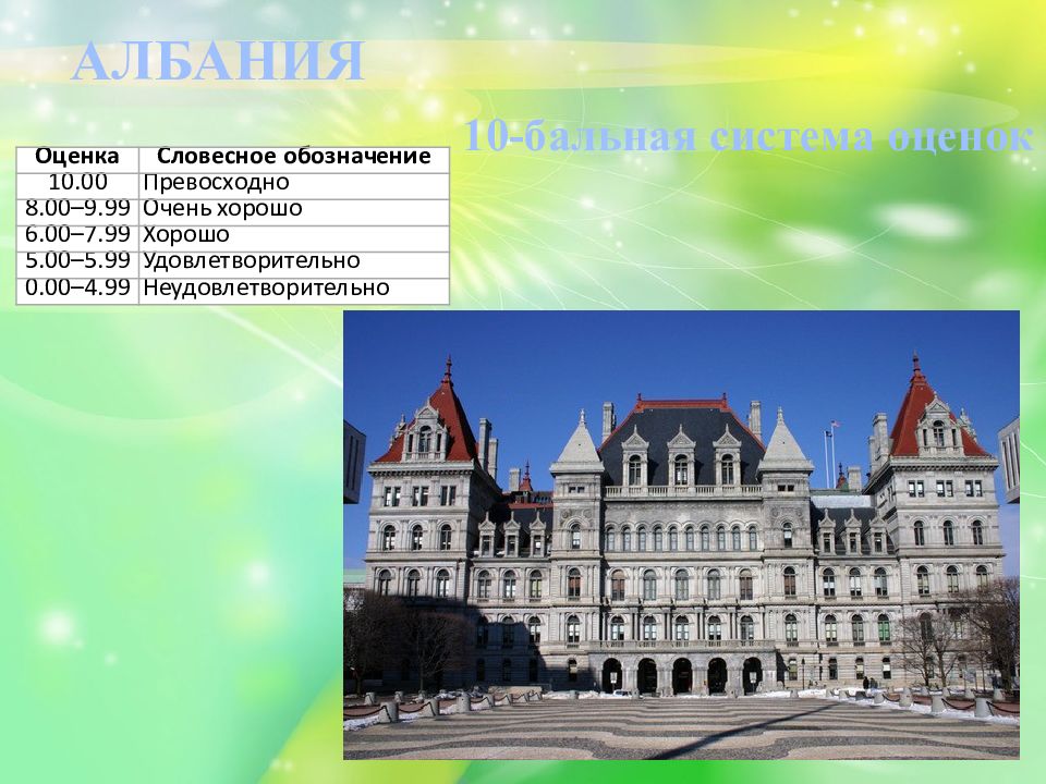 Оценка Словесное обозначение 10.00 Превосходно 8.00–9.99 Очень хорошо 6.00–7.99 Хорошо 5.00–5.99 Удовлетворительно 0.00–4.99 Неудовлетворительно АЛБАНИЯ 10 -бальная система оценок