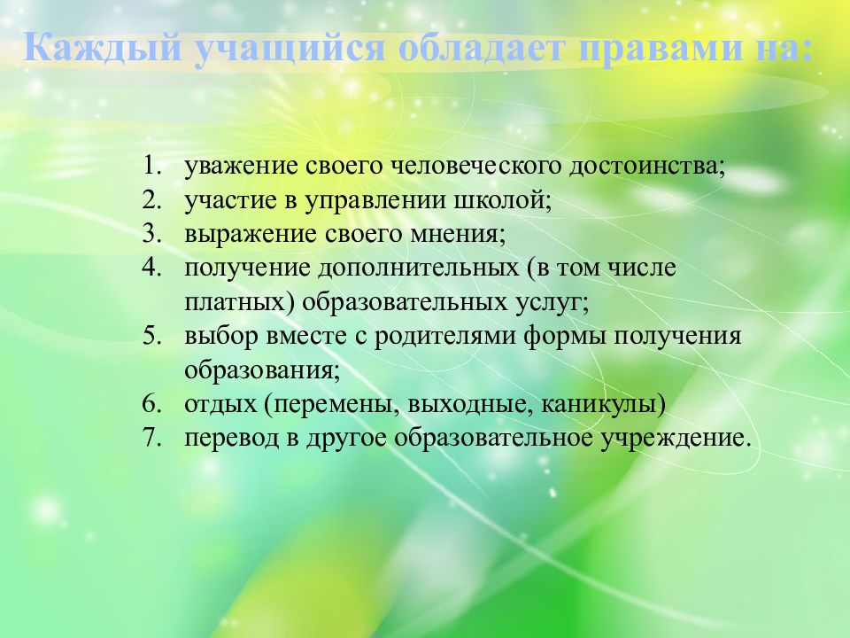 уважение своего человеческого достоинства; участие в управлении школой; выражение своего мнения; получение дополнительных (в том числе платных) образовательных услуг; выбор вместе с родителями формы получения образования; отдых (перемены, выходные, каникулы) перевод в другое образовательное учреждение. К аждый учащийся обладает правами на: