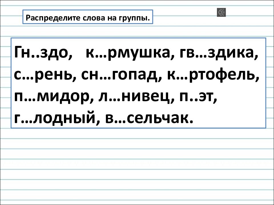 Распределите слова на группы. Гн.. здо, к… рмушка, гв … здика, с… рень, сн … гопад, к… ртофель, п… мидор, л… нивец, п.. эт, г… лодный, в… сельчак.