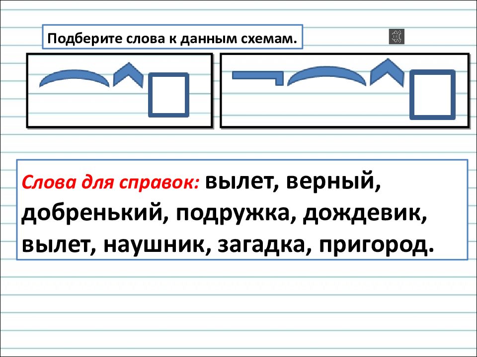 Подберите слова к данным схемам. Слова для справок: вылет, верный, добренький, подружка, дождевик, вылет, наушник, загадка, пригород.