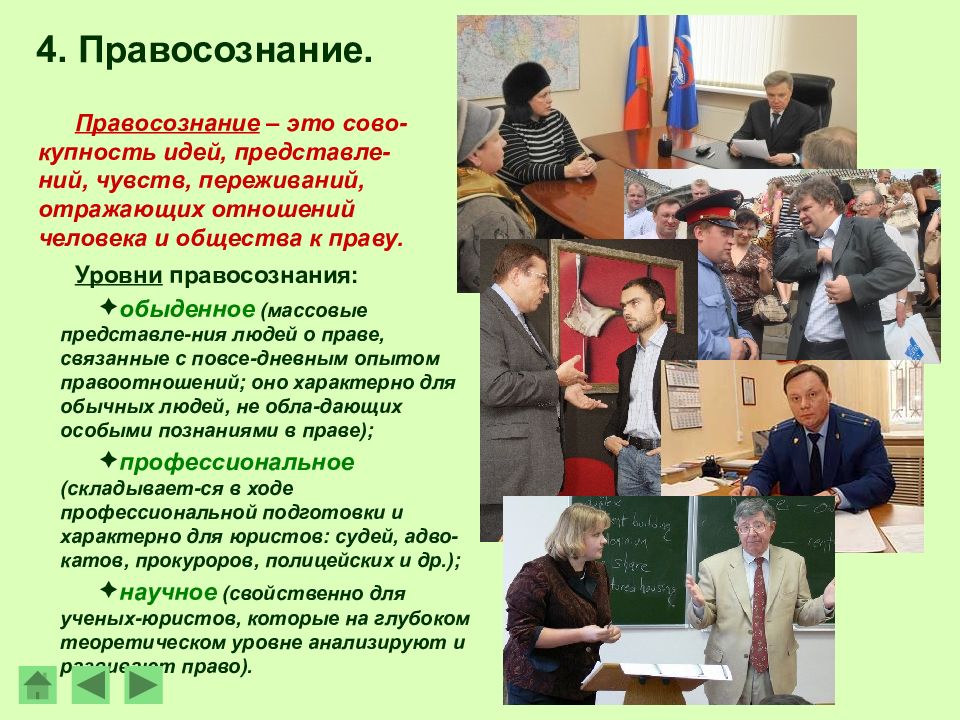 Правосознание – это сово - купность идей, представле - ний, чувств, переживаний, отражающих отношений человека и общества к праву. Уровни правосознания: обыденное (массовые представле-ния людей о праве, связанные с повсе-дневным опытом правоотношений; оно характерно для обычных людей, не обла-дающих особыми познаниями в праве); профессиональное (складывает-ся в ходе профессиональной подготовки и характерно для юристов: судей, адво-катов, прокуроров, полицейских и др.); научное (свойственно для ученых-юристов, которые на глубоком теоретическом уровне анализируют и развивают право). 4. Правосознание.