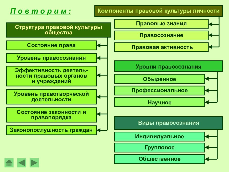П о в т о р и м : Компоненты правовой культуры личности Правовые знания Правосознание Правовая активность Структура правовой культуры общества Состояние права Уровень правосознания Эффективность деятель- ности правовых органов и учреждений Уровень правотворческой деятельности Состояние законности и правопорядка Законопослушность граждан Уровни правосознания Обыденное Профессиональное Научное Виды правосознания Индивидуальное Общественное Групповое