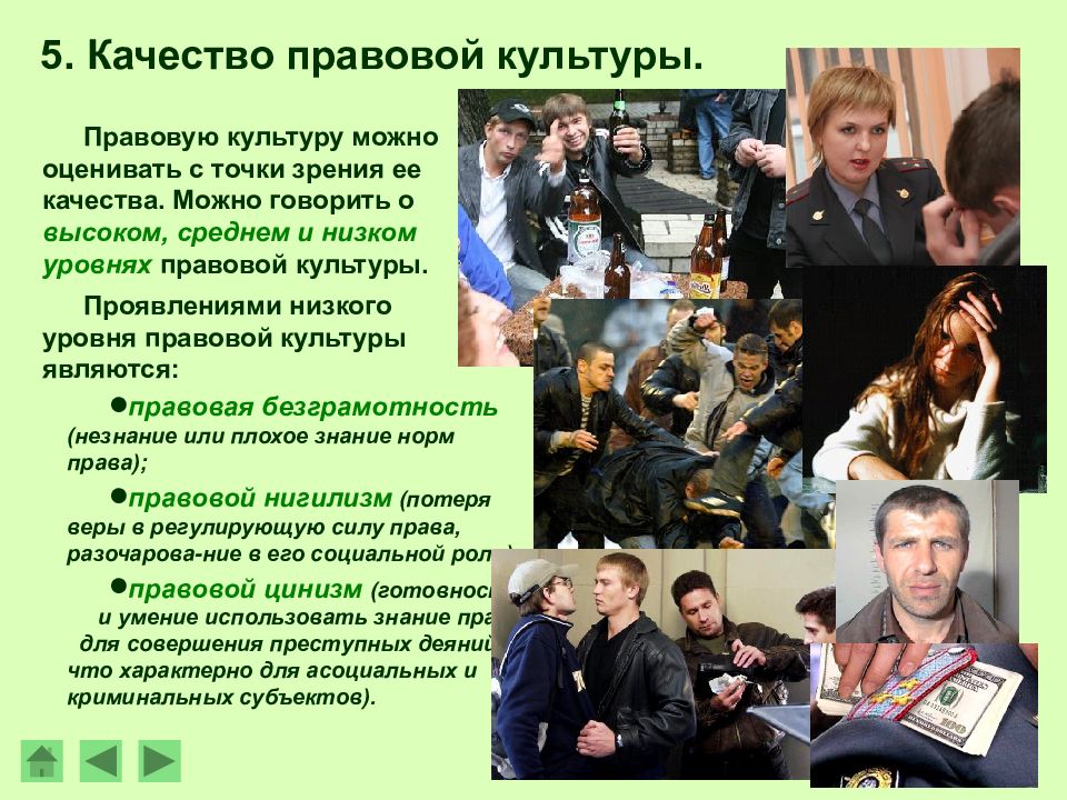 Правовую культуру можно оценивать с точки зрения ее качества. Можно говорить о высоком, среднем и низком уровнях правовой культуры. Проявлениями низкого уровня правовой культуры являются: правовая безграмотность (незнание или плохое знание норм права); правовой нигилизм (потеря веры в регулирующую силу права, разочарова-ние в его социальной роли); правовой цинизм (готовность и умение использовать знание права для совершения преступных деяний, что характерно для асоциальных и криминальных субъектов). 5. Качество правовой культуры.