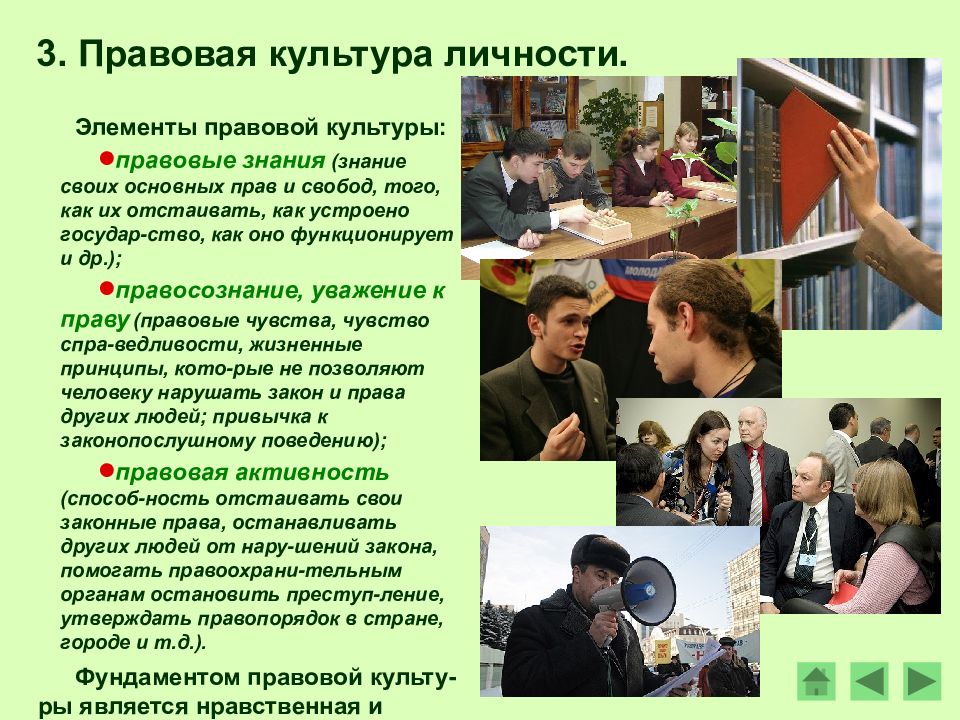 Элементы правовой культуры: правовые знания (знание своих основных прав и свобод, того, как их отстаивать, как устроено государ-ство, как оно функционирует и др.); правосознание, уважение к праву (правовые чувства, чувство спра-ведливости, жизненные принципы, кото-рые не позволяют человеку нарушать закон и права других людей; привычка к законопослушному поведению); правовая активность (способ-ность отстаивать свои законные права, останавливать других людей от нару-шений закона, помогать правоохрани-тельным органам остановить преступ-ление, утверждать правопорядок в стране, городе и т.д.). Фундаментом правовой культу-ры является нравственная и политическая культура.