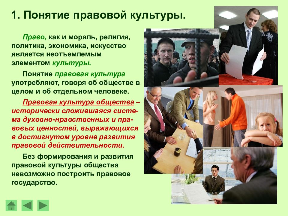 Право, как и мораль, религия, политика, экономика, искусство является неотъемлемым элементом культуры. Понятие правовая культура употребляют, говоря об обществе в целом и об отдельном человеке. Правовая культура общества – исторически сложившаяся систе-ма духовно-нравственных и пра-вовых ценностей, выражающихся в достигнутом уровне развития правовой действительности. Без формирования и развития правовой культуры общества невозможно построить правовое государство. 1. Понятие правовой культуры.