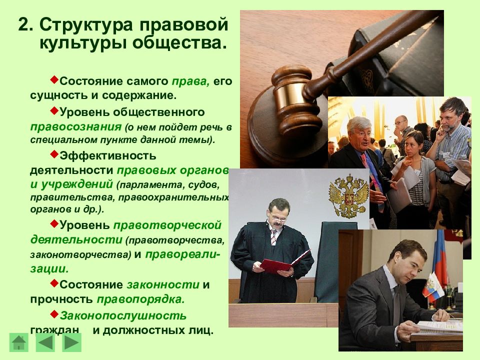 Состояние самого права, его сущность и содержание. Уровень общественного правосознания (о нем пойдет речь в специальном пункте данной темы). Эффективность деятельности правовых органов и учреждений (парламента, судов, правительства, правоохранительных органов и др.). Уровень правотворческой деятельности (правотворчества, законотворчества) и правореали-зации. Состояние законности и прочность правопорядка. Законопослушность граждан и должностных лиц. 2. Структура правовой культуры общества.
